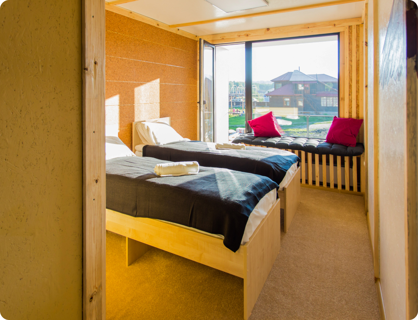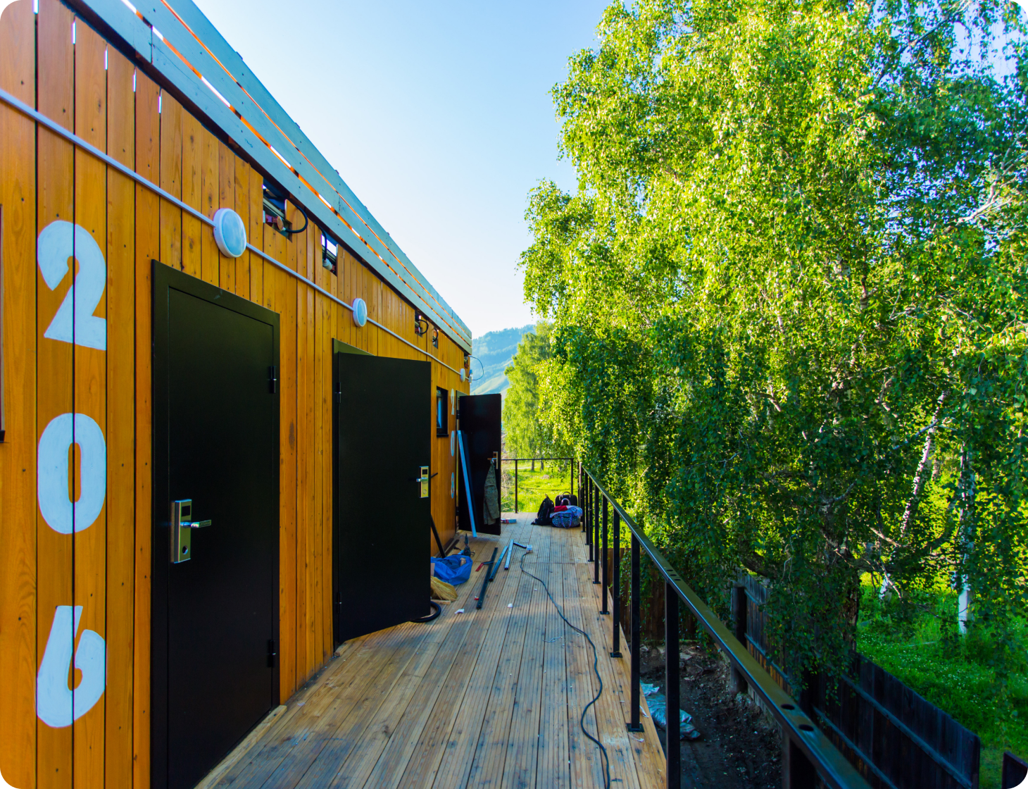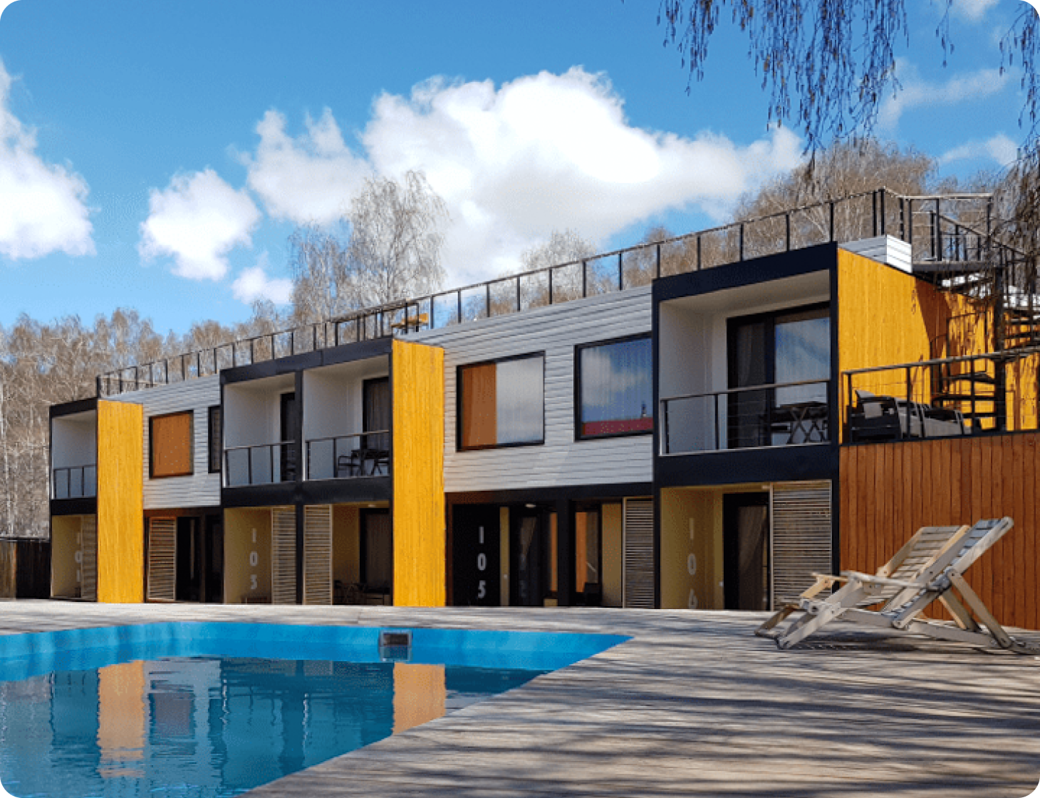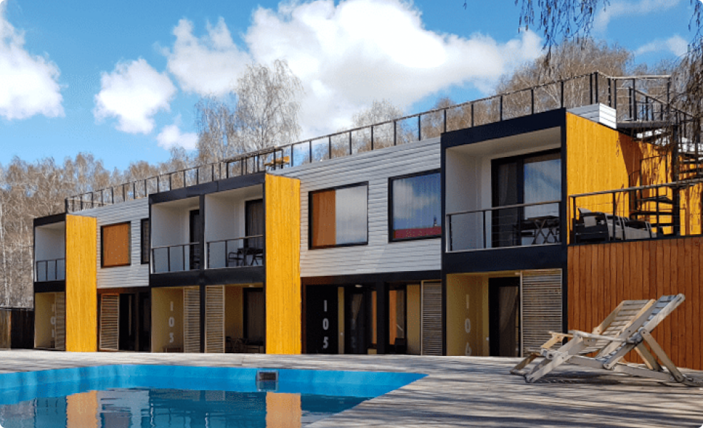 Бунгало: модульный дом, возводимый на сваях, обычно имеет один этаж с плоской крышей. Он